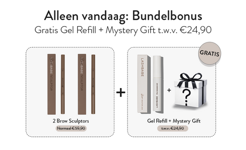 De twee pennen apart kosten €59,90. De Clear Gel Refill is €14,95 los. De Mystery Clip is €9,95. Totale waarde: €84,80. Jij betaalt €44,95. Je bespaart €39,85 — en je hebt alles in huis voor salonwaardige wenkbrauwen voor maanden.