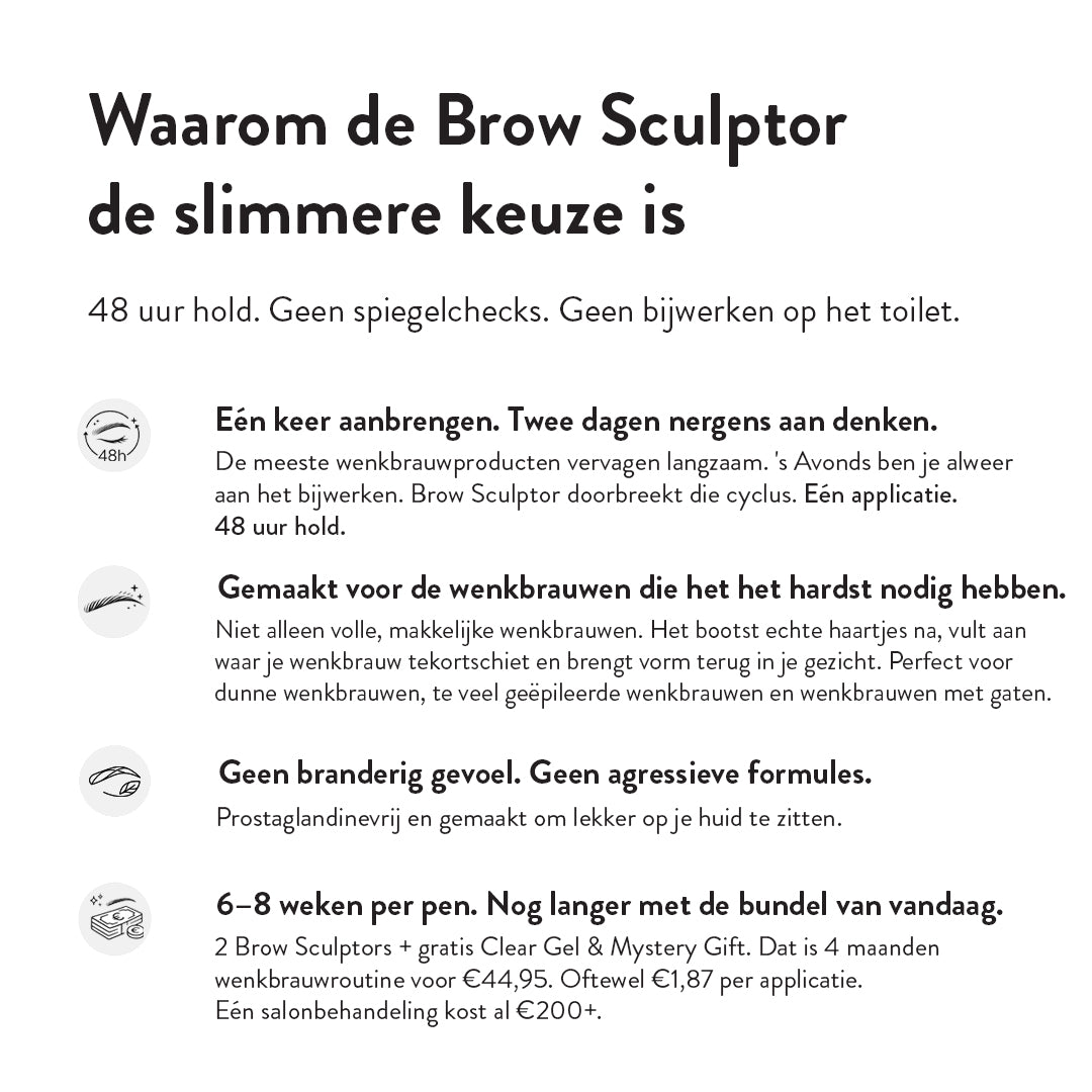 Eén Brow Sculptor gaat 6–8 weken mee bij gebruik om de dag. Met twee pennen en een Clear Gel Refill heb je genoeg voor 4–6 maanden. Dat is minder dan €1,87 per applicatie voor wenkbrauwen die 48 uur blijven zitten.